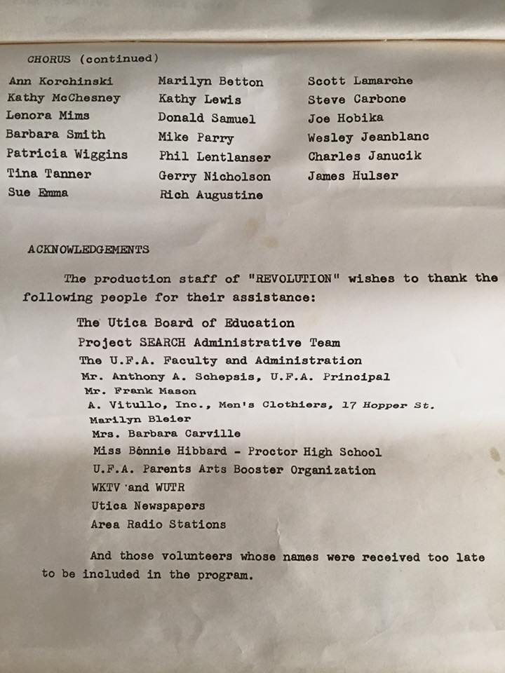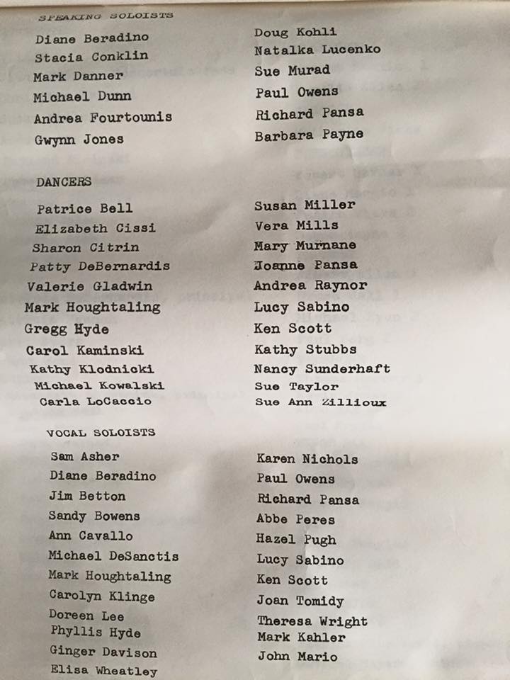 I plopped myself down at one end of a table and continued working on the reunion playlist after having emptied the portfolio of memorabilia I’d hauled along – newspaper articles, two two-album cast recordings – one of the original production and one of the piece we’d done the year before (“Truth of Truths”), both signed on the inside, of course, by castmates and teachers.