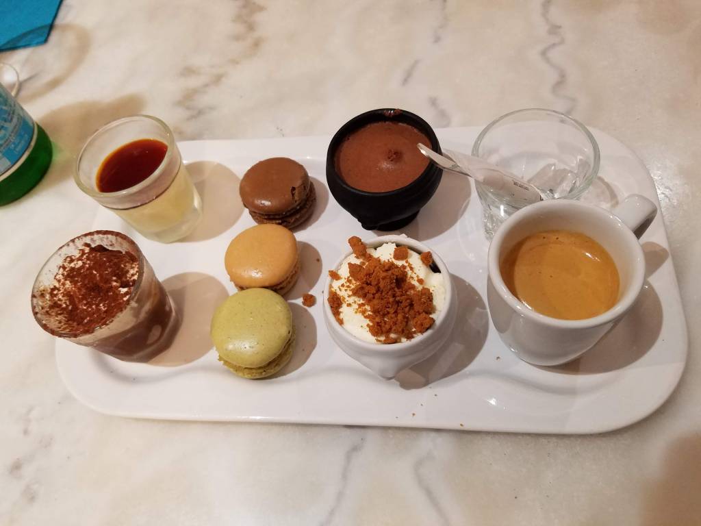 We contemplated the many offerings on the dessert board, each looking more tempting than the last, until another patron suggested we order the assortment, which also came with coffee. When the server set down a tray with four shotglass-sized dishes, three tiny macarons and a cup of espresso, it was all I could do to not throw my arms in the air and yell “Vive l’France!” in the middle of the restaurant.