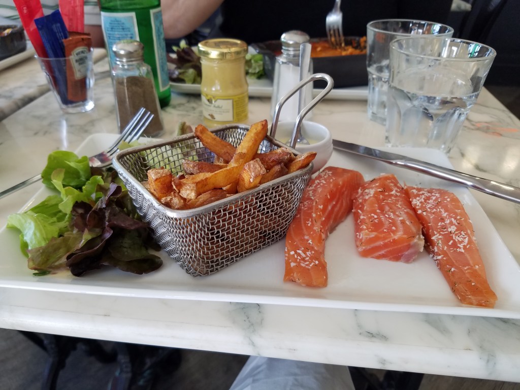 I am proud to announce that my first meal in France came with – I am not kidding – French fries. It was part of a lunch menu item that included salad and gravlax. In no US universe would I ever find this particular combination of my favorite foods. So, thank you, France, for fulfilling a fantasy I never even knew I had.