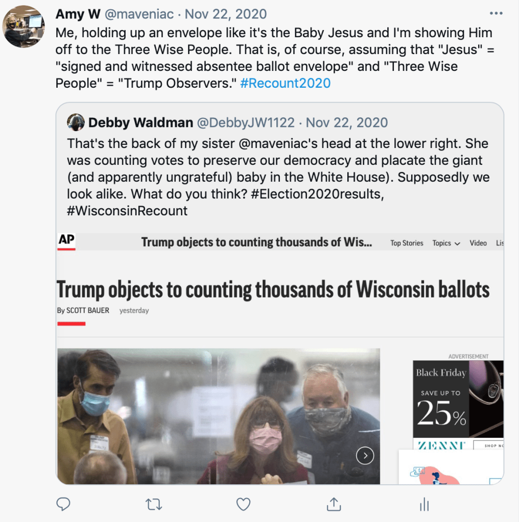 Two days prior, the Trump Campaign had wired $3 million to recount the vote in Wisconsin’s two most populous (also liberal & melanin-rich) counties (Dane and Milwaukee.) They’d gotten a quote for $7.9 million to recount the entire state but went for the cheaper option. The money came from donors who believed his lies about a “stolen election.”