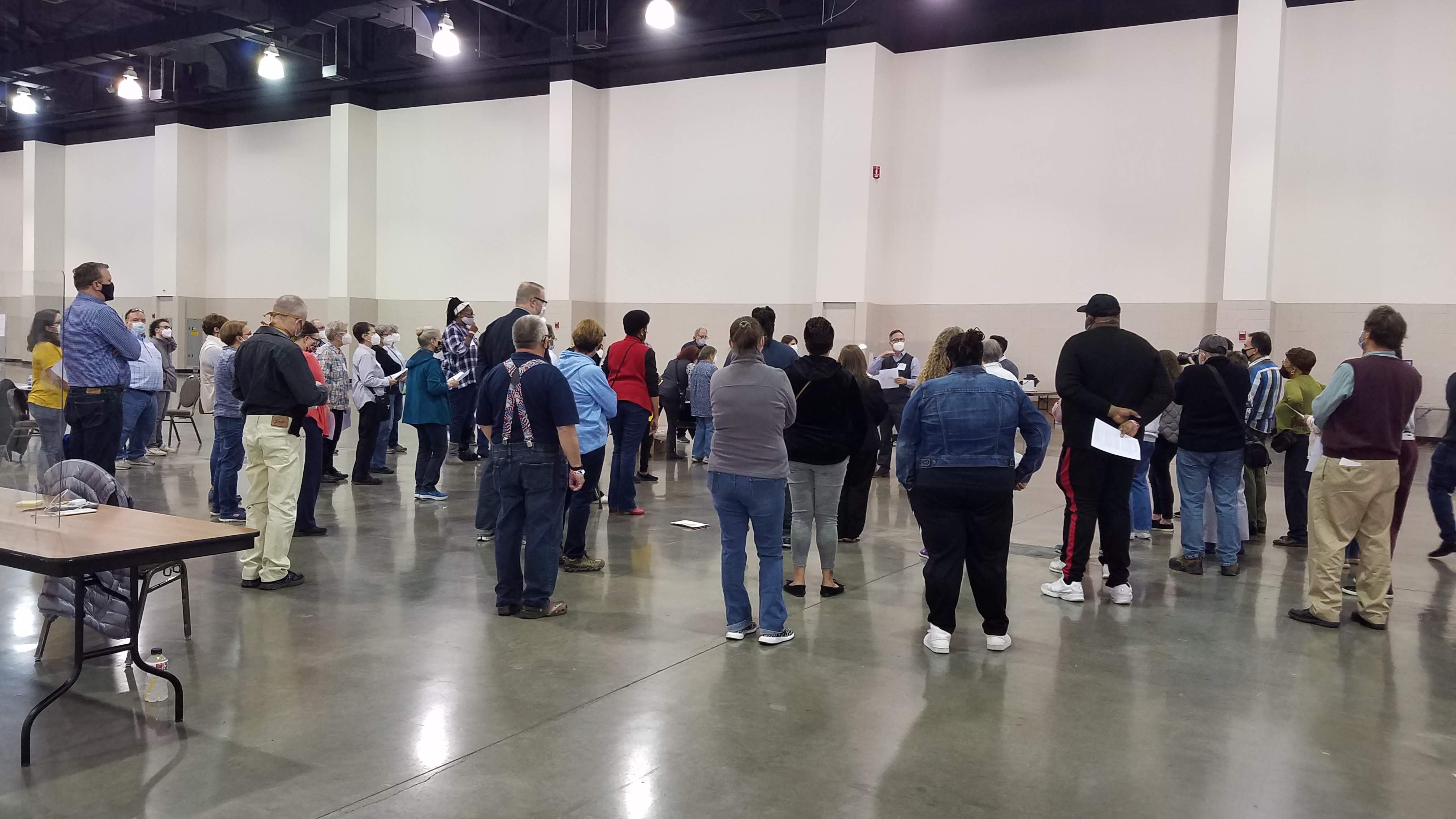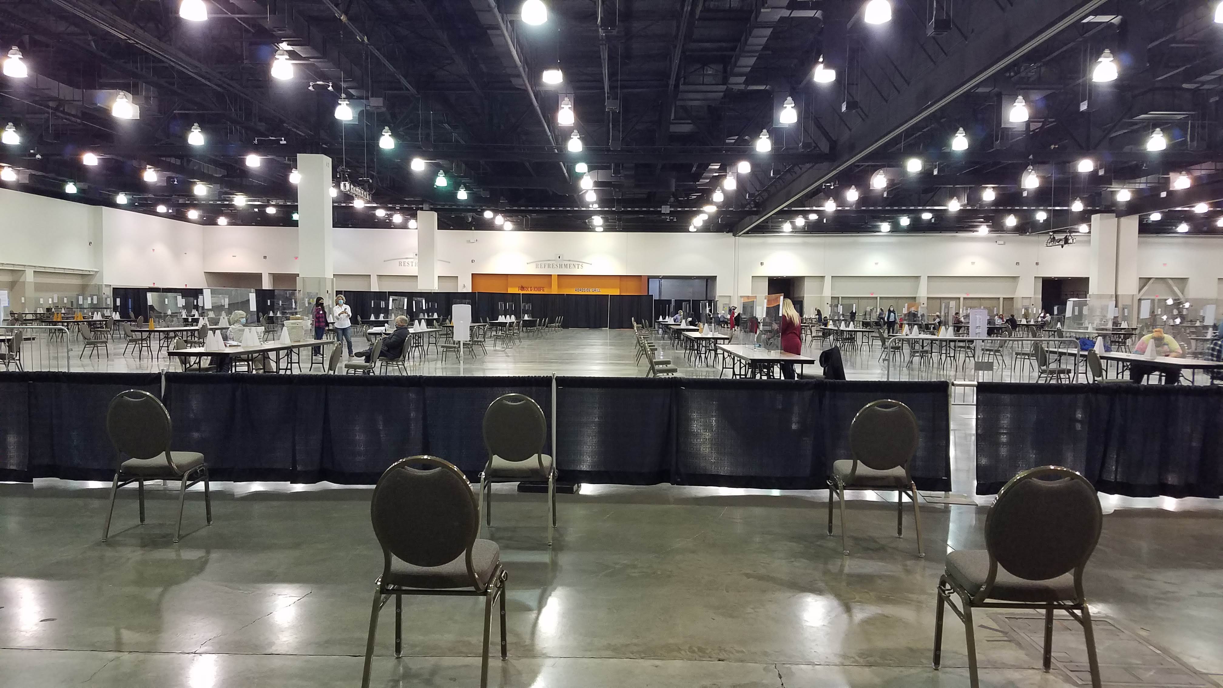 It looked like the weirdest wedding reception setup ever. Immediately inside “Hall D” was holding area where chairs, placed at socially distanced intervals, faced a monitor. Most of rest of the room was taken up by rows of tables. Each had a plexiglass shield bisecting it; two chairs on one side were for us – the counters. The three across from us were for observers. The idea was to accommodate one Republican, one Democrat and one Independent.