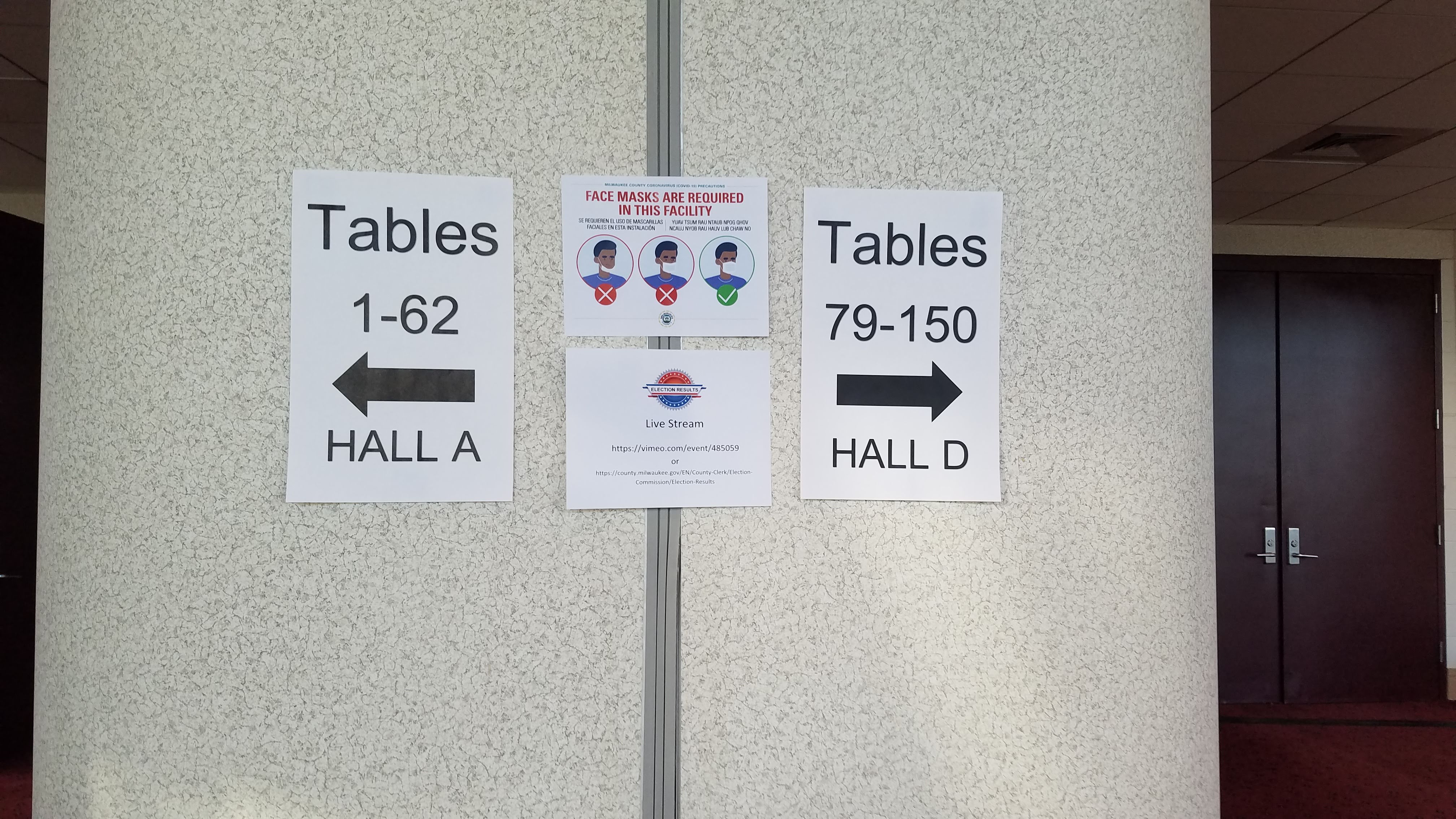 The Milwaukee County Election Commission was set up against the wall closest to the entrance at the midpoint of the room. Lawyers for both campaigns were amassing, as were media. The room was bisected by a row of tables without plexiglass; those were for media. There was also another row of socially distanced chairs set up facing the Election Commission area.