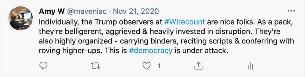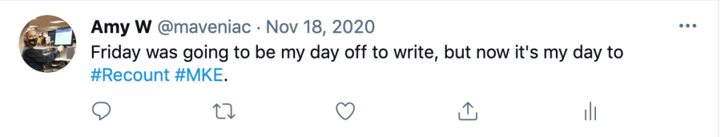I spent a peaceful Saturday working at the library. Meanwhile, over at Recount Central, the counters were suffering more abuse. On the upside, the observers were getting schooled.  One was ejected after getting physical with a Sheriff’s deputy because she didn’t want to wear a mask. The third chair was removed from every table, only one observer from each party was allowed at a table and everyone had to wear a mask. Over their noses, too.